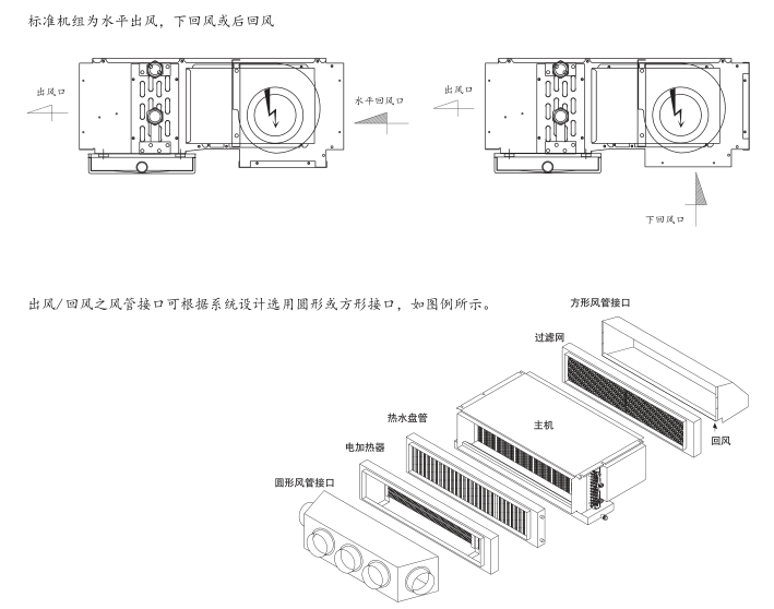 规格 8、10、12、14和20五种规格,标准工况制冷量5~18.5kw,风量500~3300m3/h,提供热水盘管/电加热器,过滤网,圆形/方形风道接口,温控器/三通阀等多种选项。 高 静 压-机外余压0~245Pa,可连接10米长以上风管,最大限度地弥补普通风机盘管静压小的不足。 小 高 度-最大高度仅为365m m ,可用作超薄型吊顶式空调箱和新风机组。灵活多变-选择不同形状和数量的风道接口,可与风管系统设计及安装巧妙配合。 凝结水盘-整体冲压一次成型,无接缝,杜绝漏水现象,机组设计为水盘带有一定的倾斜度,确保冷凝水迅速排出。
